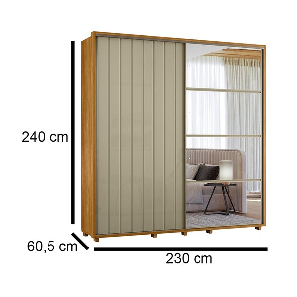 As duas portas de correr com amortecimento garantem um deslizamento suave e silencioso. O espelho na porta valoriza a funcionalidade, sendo ideal para o uso diário, ao mesmo tempo que agrega estilo ao quarto. O acabamento ripado angular proporciona um toque moderno e marcante.