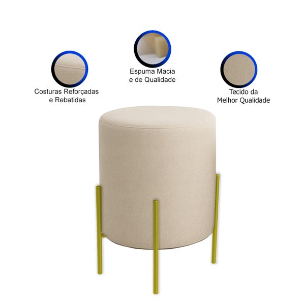 Revestido em tecido Bouclé, que confere textura macia e aspecto visual acolhedor, o puff proporciona um toque de sofisticação à decoração. Os pés de ferro com pintura Dourado garantem resistência e um contraste moderno, valorizando ainda mais o design orgânico da peça.