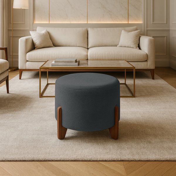 Os pés em madeira maciça de eucalipto garantem estabilidade, resistência e um toque de charme natural ao visual da peça. Com estrutura firme e proporções bem definidas (44 cm de altura e 50 cm de diâmetro), o Puff Veneza é compacto e versátil e funciona como assento extra, apoio para os pés ou até como mesa lateral com bandeja decorativa.